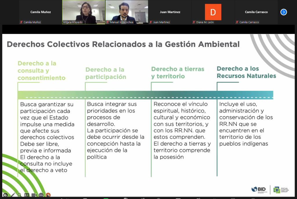 En seguida, Angela Acevedo profundizó en los Derechos Colectivos relacionados a la Gestión Ambiental, entre los que destacan el derecho a la consulta y consentimiento, a la participación en los procesos de desarrollo, la propiedad de tierras y territorio, además del derecho al uso, administración y conservación de los recursos naturales que se encuentren en los territorios de pueblos indígenas, entre otros.