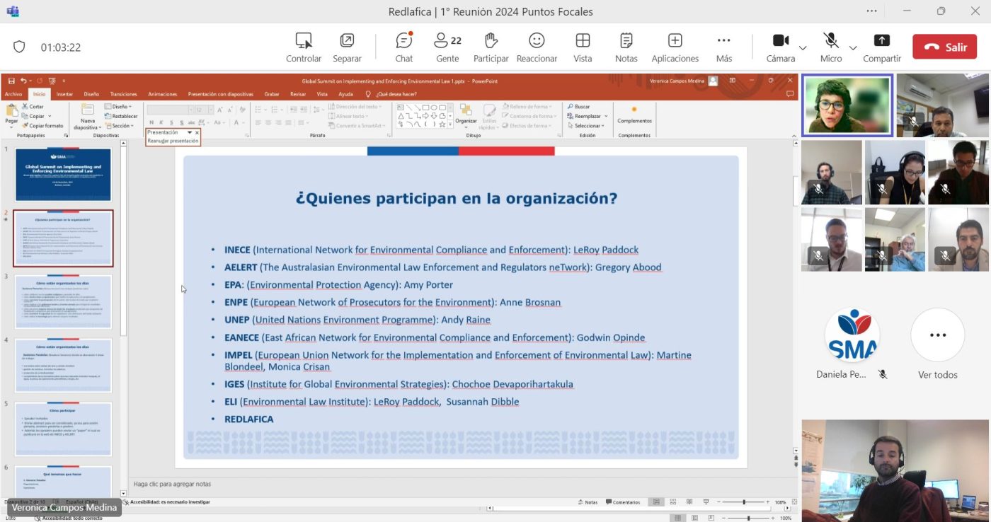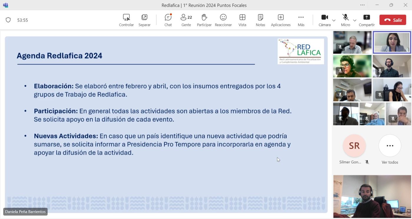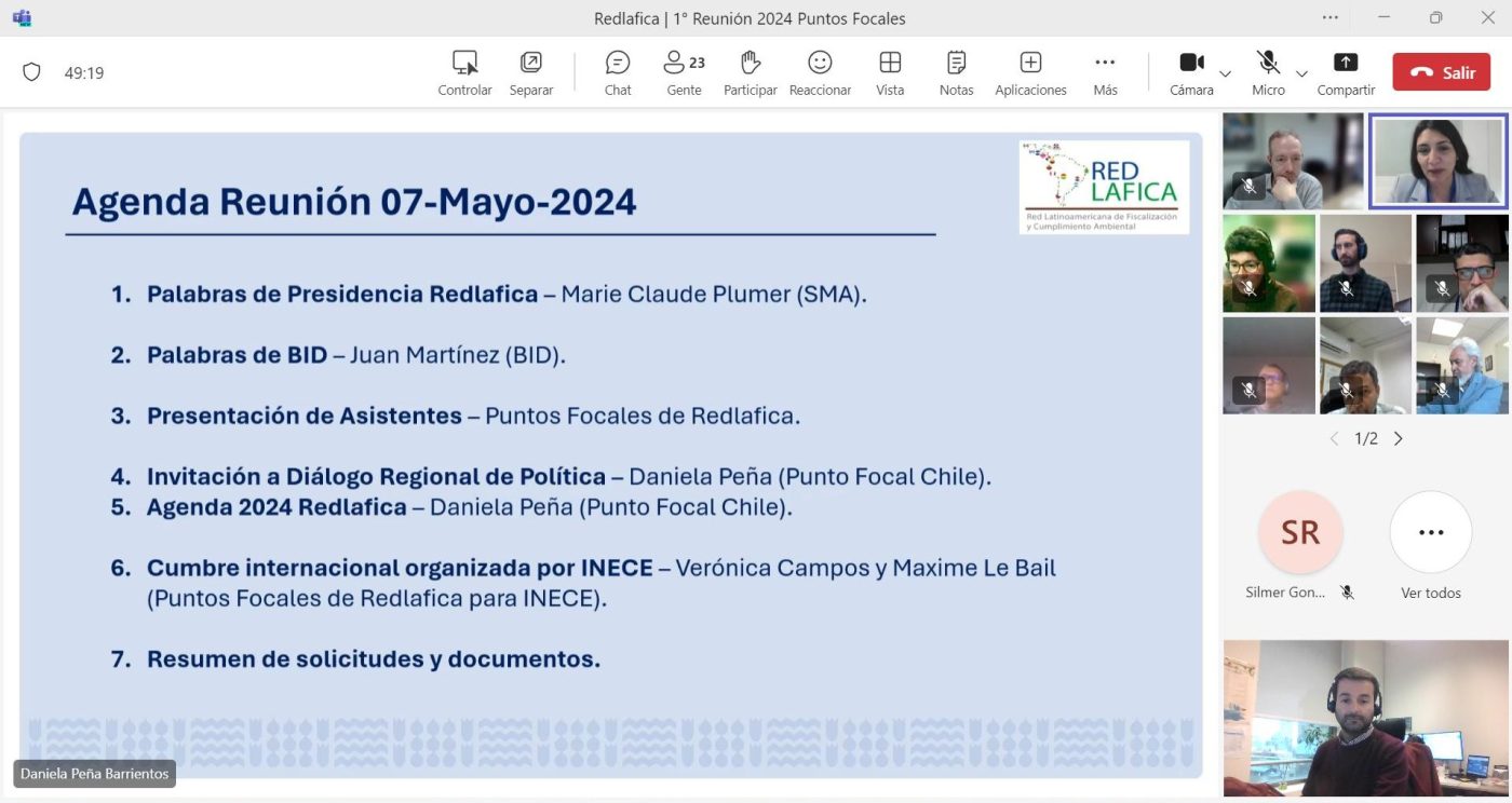Santiago, Chile, 7 de mayo de 2024.- La Presidencia Pro Tempore de la Red Latinoamericana de Fiscalización y Cumplimiento Ambiental (REDLAFICA), a través de Daniela Peña, jefa de la Oficina de Gestión Estratégica de la Superintendencia del Medio Ambiente (SMA) de Chile y Coordinadora de la Red; lideró esta tarde una sesión extraordinaria de trabajo con todos y todas los Puntos Focales designados por los países miembros de la Entidad, con el objetivo de revisar los avances del Plan Estratégico comprometido para el periodo 2024, así como también revisar en líneas generales el Plan de Acción del BID con REDLAFICA y REDLASEIA, que se enmarca en los Diálogos Regionales de Política de Licenciamiento y Fiscalización Ambiental y Social (DRP).