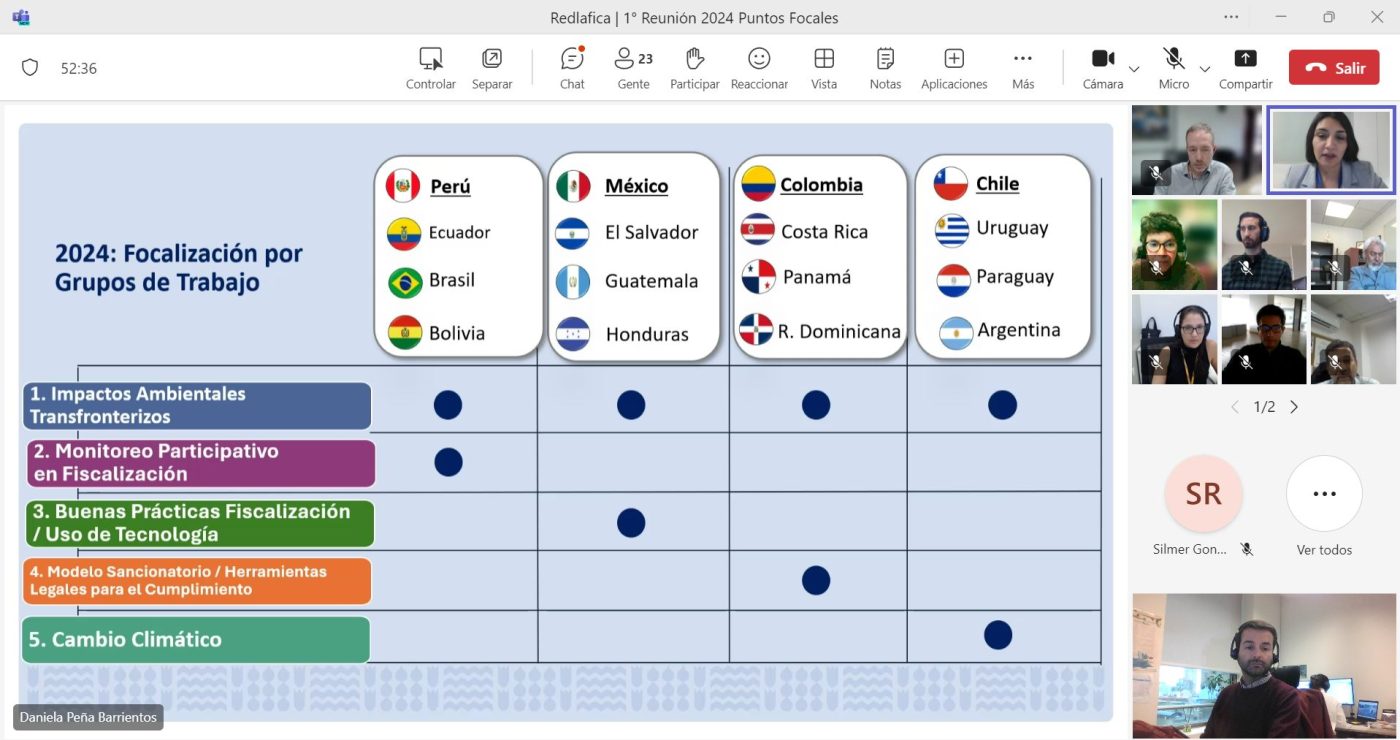 Sumado a lo anterior, también abordó las líneas generales de la agenda de REDLAFICA durante este período y cuya focalización se ha centrado en grupos de trabajos: i) Impactos Ambientales Fronterizos; ii) Monitoreo Participativo en Fiscalización; iii) Buenas Prácticas de Fiscalización / Uso de Tecnologías; iv) Modelo Sancionatorio / Herramientas Legales para el Cumplimiento; y v) Cambio Climático. Cada uno de estos grupos está integrado por los diferentes países que conforman la Red con el objeto de compartir experiencia al respecto, así como reforzar estas materias.