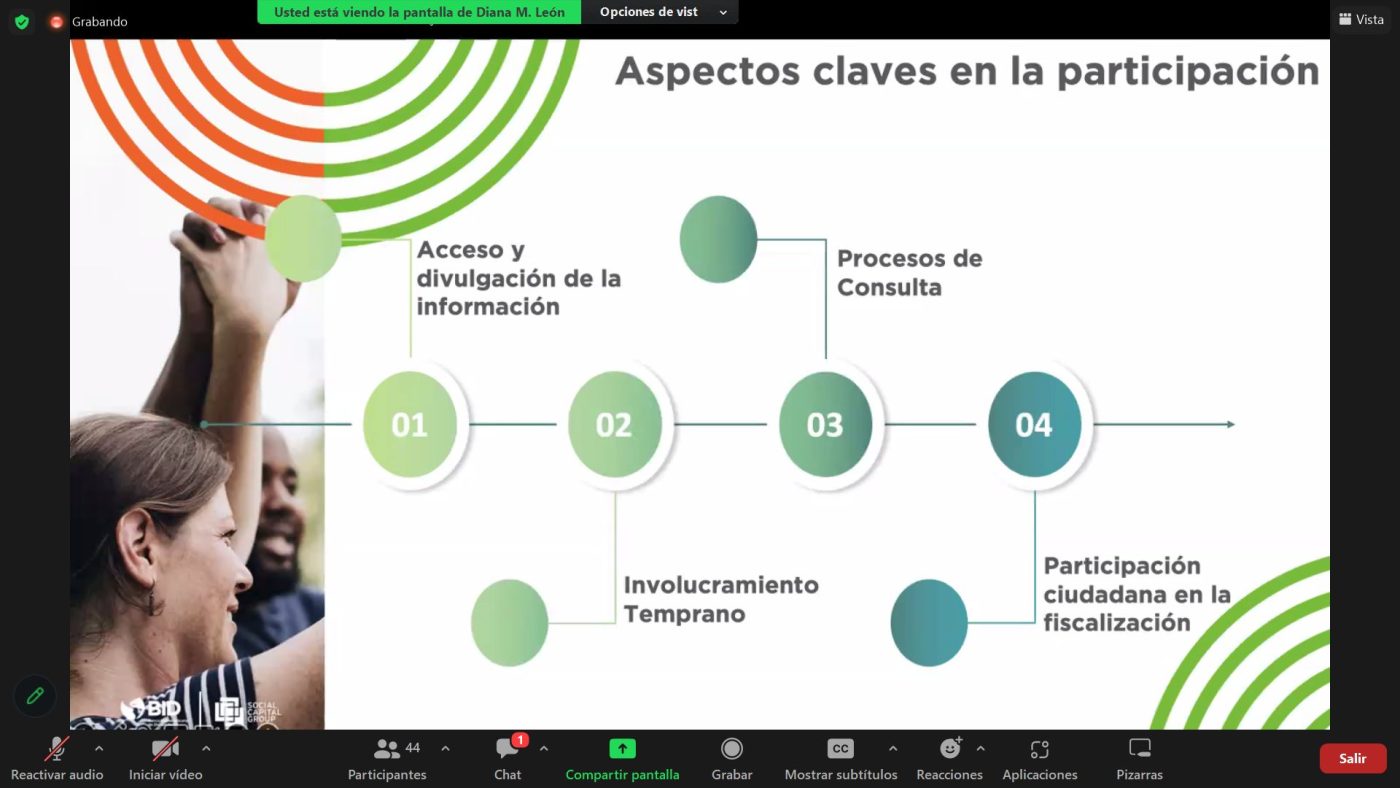 La actividad abordó la Participación Ciudadana en la Gestión Ambiental con una actividad interactiva a cargo de Paola Rosales, consultora de SCG a cargo de las tres notas técnicas. De acuerdo con lo planteado en el taller, se espera que la participación ciudadana sea un proceso continuo e incluyente que se busca concretar a través de mecanismos estatales de transparencia y acceso a la información, además de procesos de consulta previa a los Pueblos Indígenas.