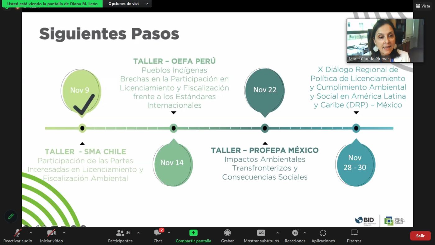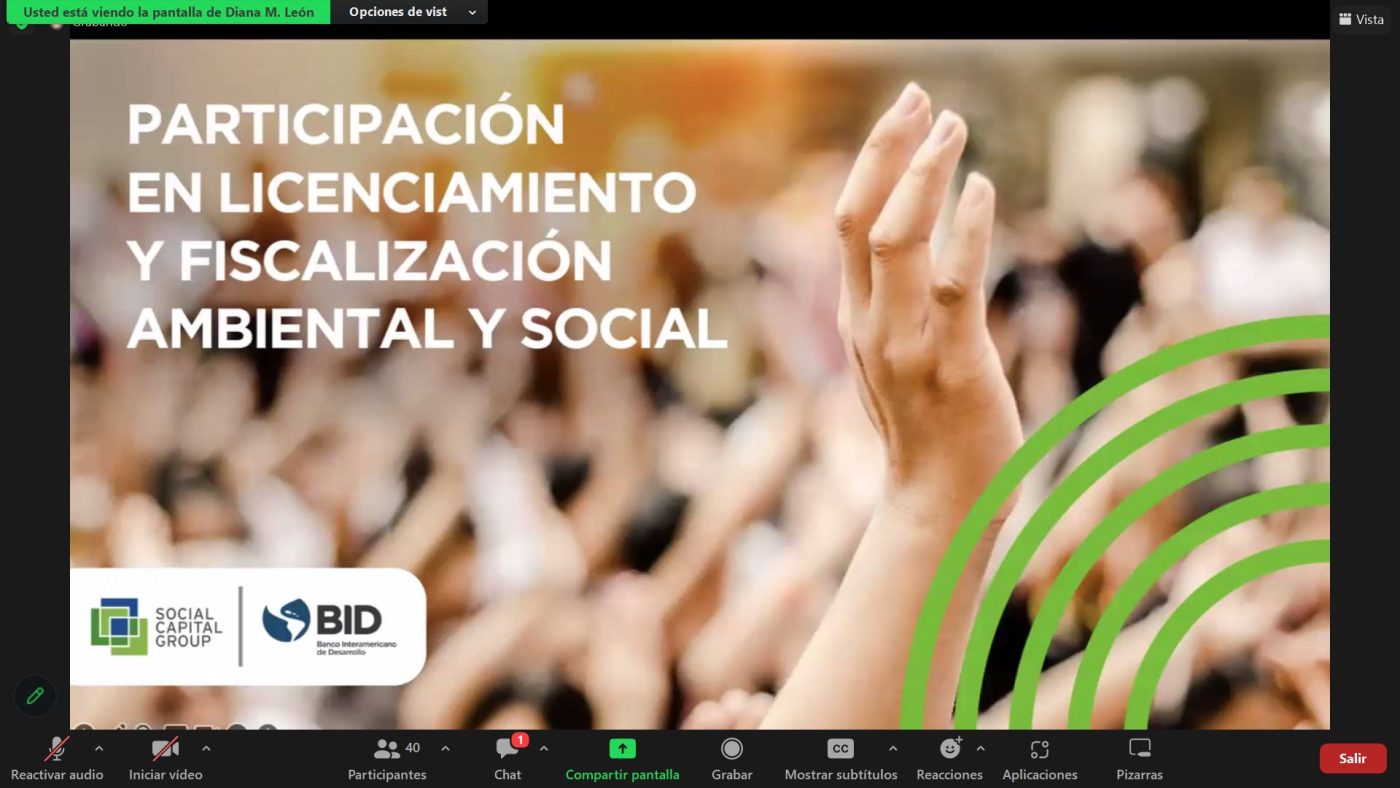 Por su parte, Andreina Pérez, Especialista del BID destacó que “es un placer para el banco estar en este espacio y nos gustaría resaltar el compromiso del banco con el fortalecimiento de los sistemas nacionales de licenciamiento y fiscalización ambiental y social. Como se ha mencionado, durante el 2023 hemos trabajado coordinadamente con la REDLAFICA y una de las actividades que adelantamos fue el desarrollo de estas tres notas técnicas, que a partir de hoy, se están implementando en los talleres temáticos que se han programado durante este mes. Y en el nombre del banco queríamos agradecer todo el trabajo que ha desarrollado Social Capital Group por la asistencia técnica y, sobre todo, destacar y felicitar la participación activa de todos los países durante el proceso, en especial Chile, Perú y México que lideraron cada uno de los temas”, indicó.